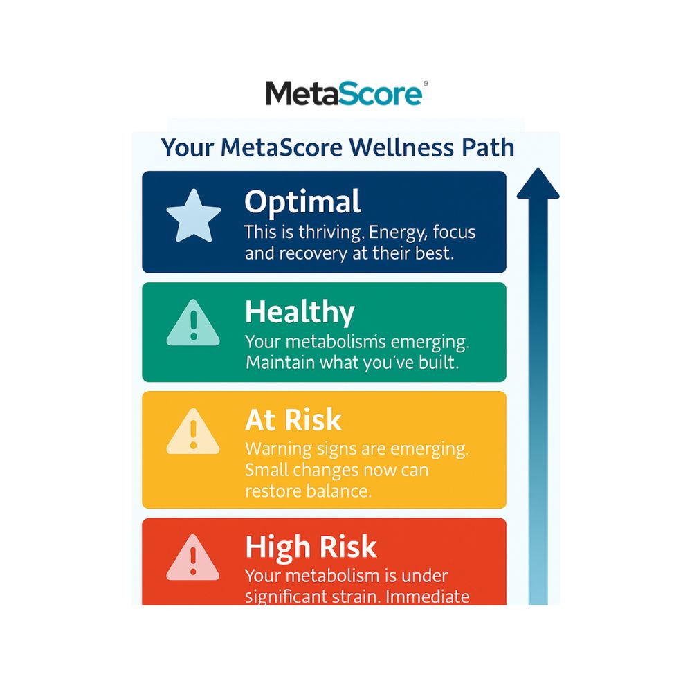 Compliance safe: MetaScore is a wellness tool, not a medical diagnosis. Results highlight trends for lifestyle improvement and can be shared with your GP if needed.
